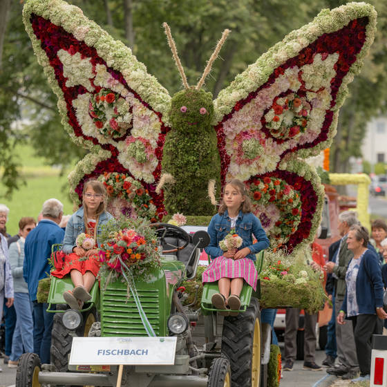 Bereits ab 11 Uhr wurden die zahlreichen Gäste bei traumhaftem Wetter mit einem zünftigen Frühschoppen willkommen geheißen. 24 liebevoll geschmückte Wägen, mit unzähligen Blüten verziert, boten den Besucherinnen und Besuchern ein eindrucksvolles Schauspiel.